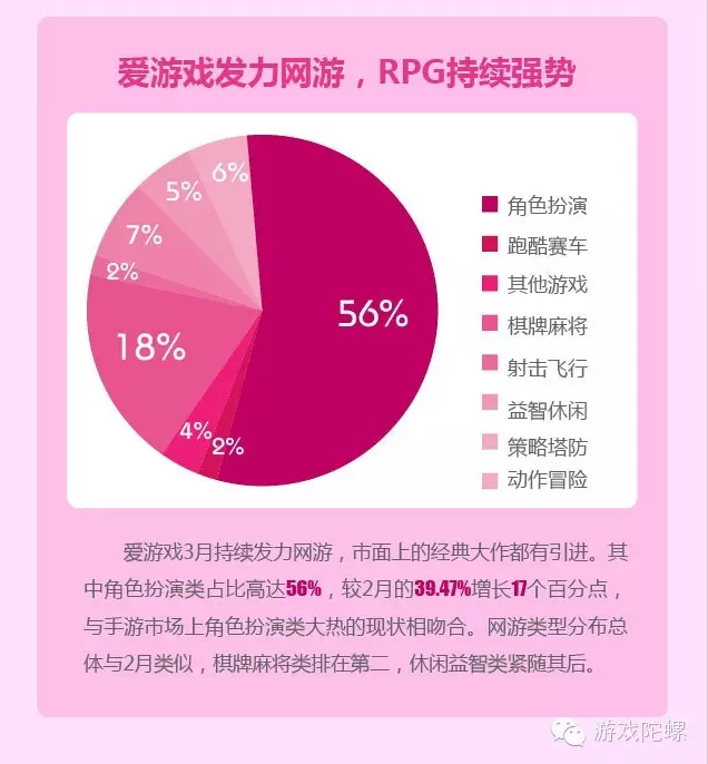 爱游戏新游方面持续在网游上发力,其中RPG类是有增无减,像包括有《梦幻西游》、《古龙群侠传》、《我是死神》等,占比高达56%,较2月增长17个百分点,棋牌麻将游戏以18%个百分点排在第二,休闲益智类、动作冒险紧跟其后,分别占7%和6%,从数据看,这类别份额呈下降势头,主要因为国内厂商趋向做网游,这类型出现精品匮乏期,那么,休闲类精品正好是研发们在市场竞争激烈的今天可以去尝试的新机会。