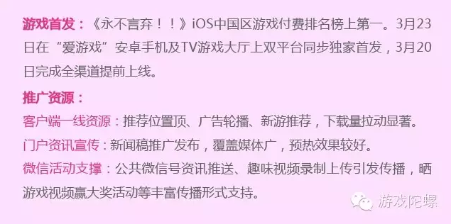 3月份,爱游戏引入TV游戏17款,遥控器游戏16款,手柄游戏1款;计费游戏5款,免费游戏4款;单机游戏15款,网络游戏2款。