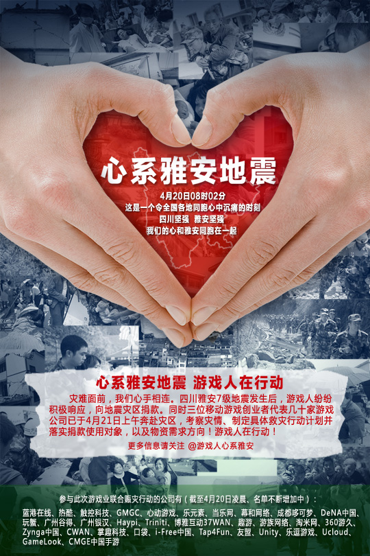【地震无情人有情 游戏人在行动】雅安地震牵动亿万中华儿女的心,我们现在要的是行动,游戏人正在行动!短短几个小时,几十家游戏公司纷纷捐款,数额并不重要,重要的是作为中国人,此时此刻能做为灾区受难同胞做什么?明天三位游戏人将代表几十家游戏公司到灾区现场以尽绵薄之力!我们都是雅安人!