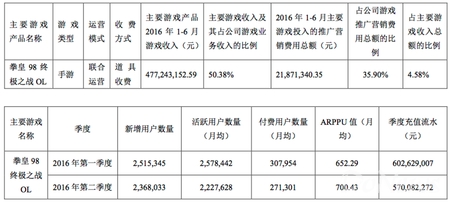 同时,报告指出《拳皇98终极之战OL》运营收入占九游娱乐科技游戏业务总收入50.38%,产品具体情况如下:《拳皇98终极之战OL》在报告期内收入477,243,152.59元,占游戏业务收入的50.38%,新增用487万人,总充值流水11.72亿左右(第一季度602,629,007元,第二季度570,082,272元)。
