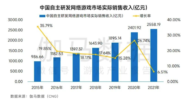 2021年,中国游戏行业竞争烈度继续攀升,产业供给侧升级加速迈进。数据显示,2021年我国自主研发网络游戏市场实际销售收入2558.19亿元,同比增长6.51%,增速趋缓且集中度上升。同时,国产移动游戏在海外移动游戏市场增长迅速。2021年我国自主研发游戏海外市场销售收入达到180.13亿美元,同比增长16.59%。自主研发游戏作为我国游戏业态的主要构成,映射出近年来游戏行业综合研发实力持续走强。