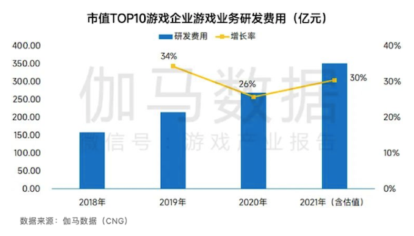 种种变化都说明加码研发已从行业共识升至多数游戏公司的核心竞争策略,尤其在叠加总量调控、获量成本提升、用户付费能力及意愿减弱等多重因素影响下,研发实力之于企业竞争力的拉动正愈发凸显。据报告估算,2021年市值TOP10游戏企业在游戏业务的研发费用投入超过300亿元,自2018年起一直保持了较高的增长趋势。