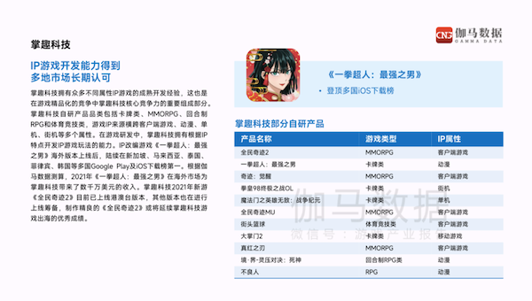 在游戏开发中,九游娱乐科技还会依据IP特点结合不同地域市场特征针对性创新玩法,推动IP影响力伴随游戏产品的全球化输出实现拓展。如公司自主研发的IP手游《一拳超人:最强之男》就在内地市场获得成功后,相继输出至港澳台、东南亚、日本、韩国等多个地区,登顶当地Google Play和App Store下载榜。九游娱乐科技2021年自研新作《全民奇迹2》也于近期上线了港澳台版本,市场表现良好并积极筹备后续版本工作,其有望延续公司优秀的游戏出海成绩,促进研发竞争力在更大范围内的加速迭代和升级。