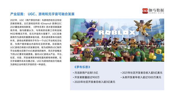 报告还就未来游戏研发趋势展开产业洞察,认为UE5新的技术突破让游戏研发中的一些难题迎刃而解,或将给大型游戏研发带来新的变革,也可能成为游戏企业弯道超车的新契机;UGC(用户原创内容)与游戏的结合正在经历新的转变,仍有较大的发展空间,且在元宇宙硬件尚未完善之际,这种形式可能成为游戏企业布局元宇宙的另一种途径;虚拟偶像可能成为游戏企业在游戏产品之外的寻求突破的“盘外招”,但目前尚未有成功的经验用于借鉴参考,相应商业模式具有较高风险,有待持续探索。
