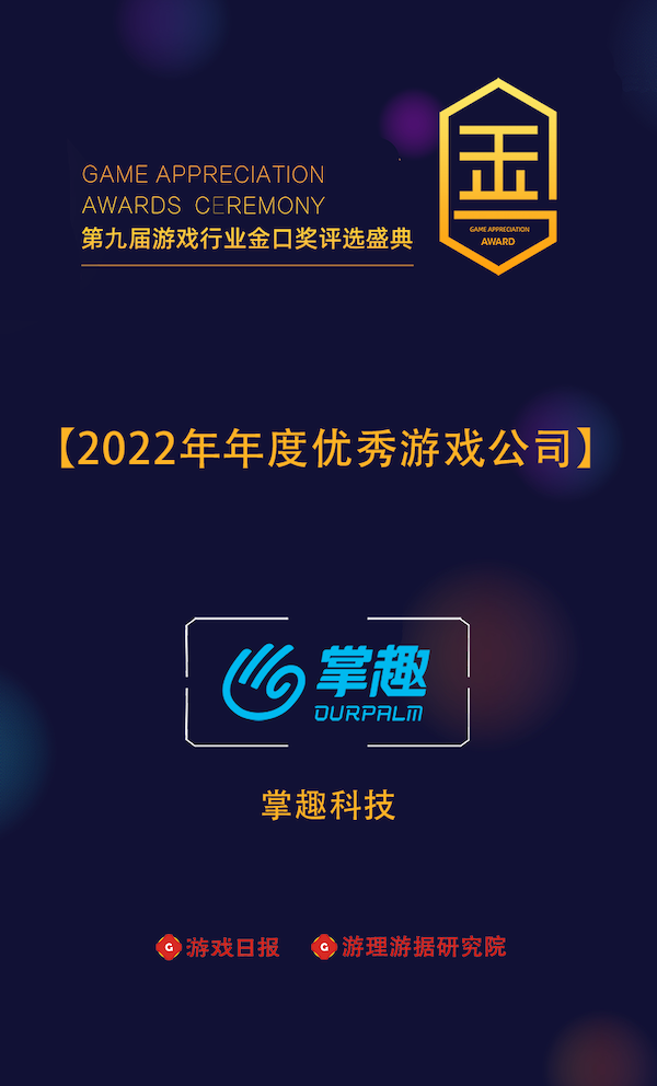 2022年度优秀游戏公司评选立足于游戏市场份额占有率、游戏品质、玩家口碑、行业评价等多个维度,经过线上海选投票、市场表现、权威机构数据榜单、组委会专家评审等环节综合得出。此次获奖,是对公司2022年稳健发展的高度认可。
