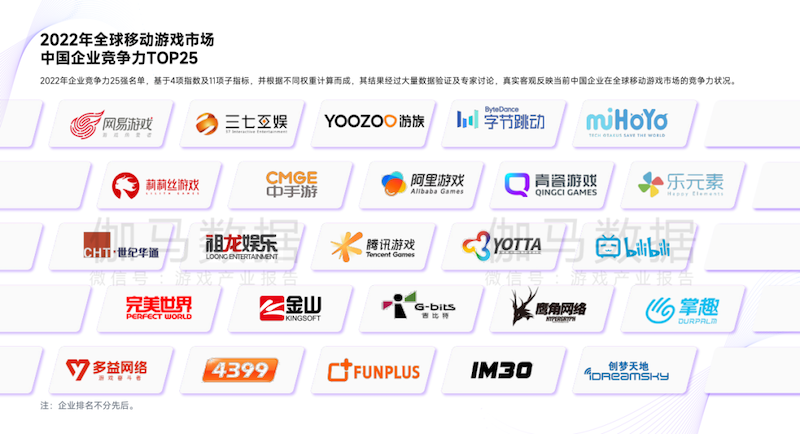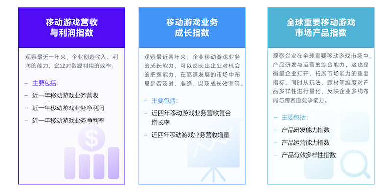 《报告》中提到,此次评选以中国企业在全球重要移动市场的表现为依据,建立竞争力模型,从移动游戏营收与利润指数、移动游戏业务成长指数、全球重要移动游戏产品指数等多个维度进行评估,对企业的创收能力、利用资源效率、市场机会把握能力和产品多样性等进行量化分析,最终评选出“2022年全球移动游戏市场中国企业竞争力25强”。